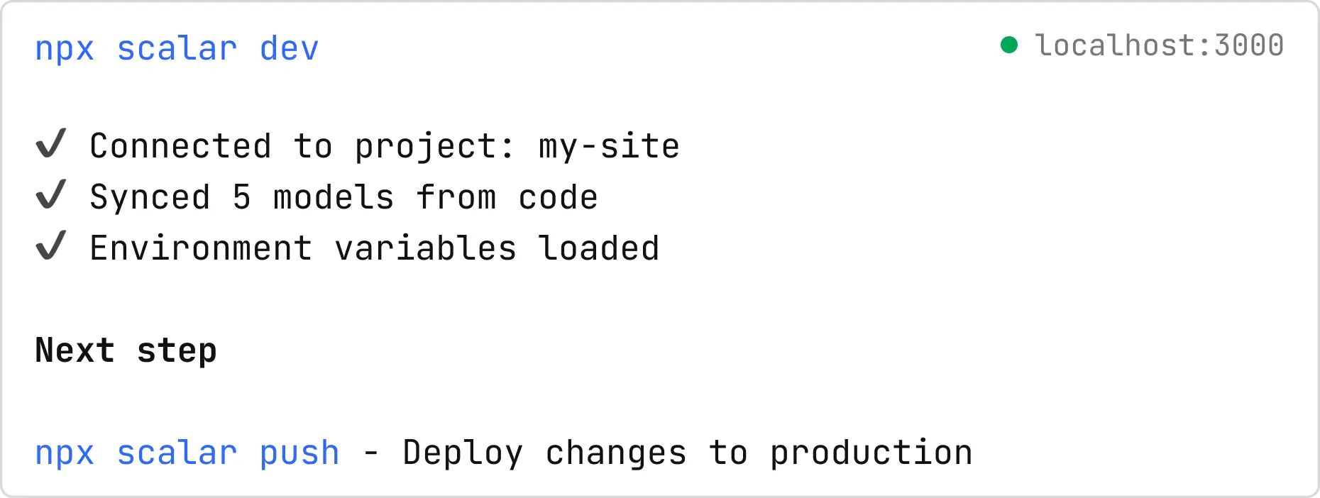 With npx scalar dev, your local environment becomes the control hub. Work offline, iterate rapidly, and push when you're ready.